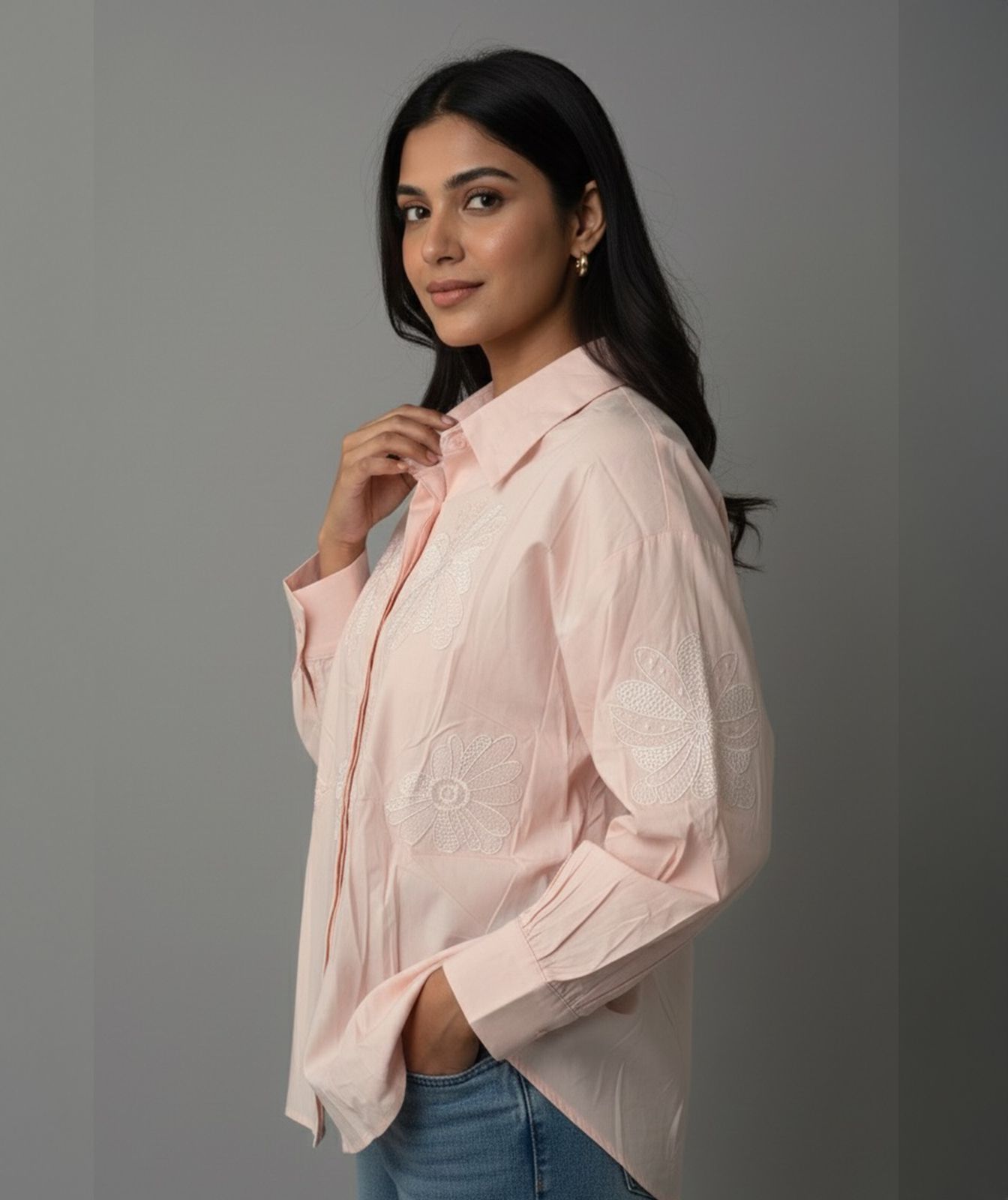 This elegant cotton shirt features bold navy blue floral embroidery that instantly elevates its look. The shirt is designed with a crisp collar, full sleeves, and a structured silhouette. The standout element is the intricate embroidered floral motifs placed across the front and on the sleeves, giving it a handcrafted, premium feel.Perfect for casual outings, office wear, or statement styling, this piece blends simplicity with artistic detailing. The breathable cotton fabric ensures all-day comfort while the embroidery adds a touch of sophistication.