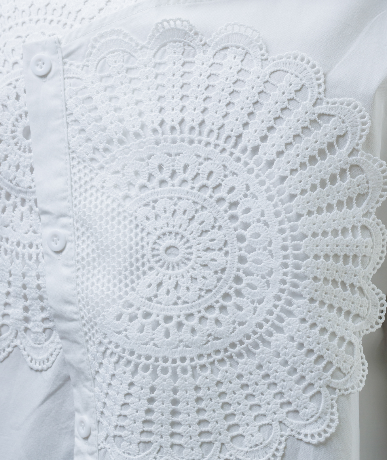Elevate your wardrobe with this one-of-a-kind shirt featuring crochet patchwork and a unique slanting button pattern that adds a contemporary twist to traditional design. Crafted from soft, breathable fabric, the shirt showcases a beautiful combination of textures and patterns. The slanting button design creates an asymmetrical yet stylish effect, giving the shirt a modern edge with its relaxed fit, classic collar, and attention to details pattern.