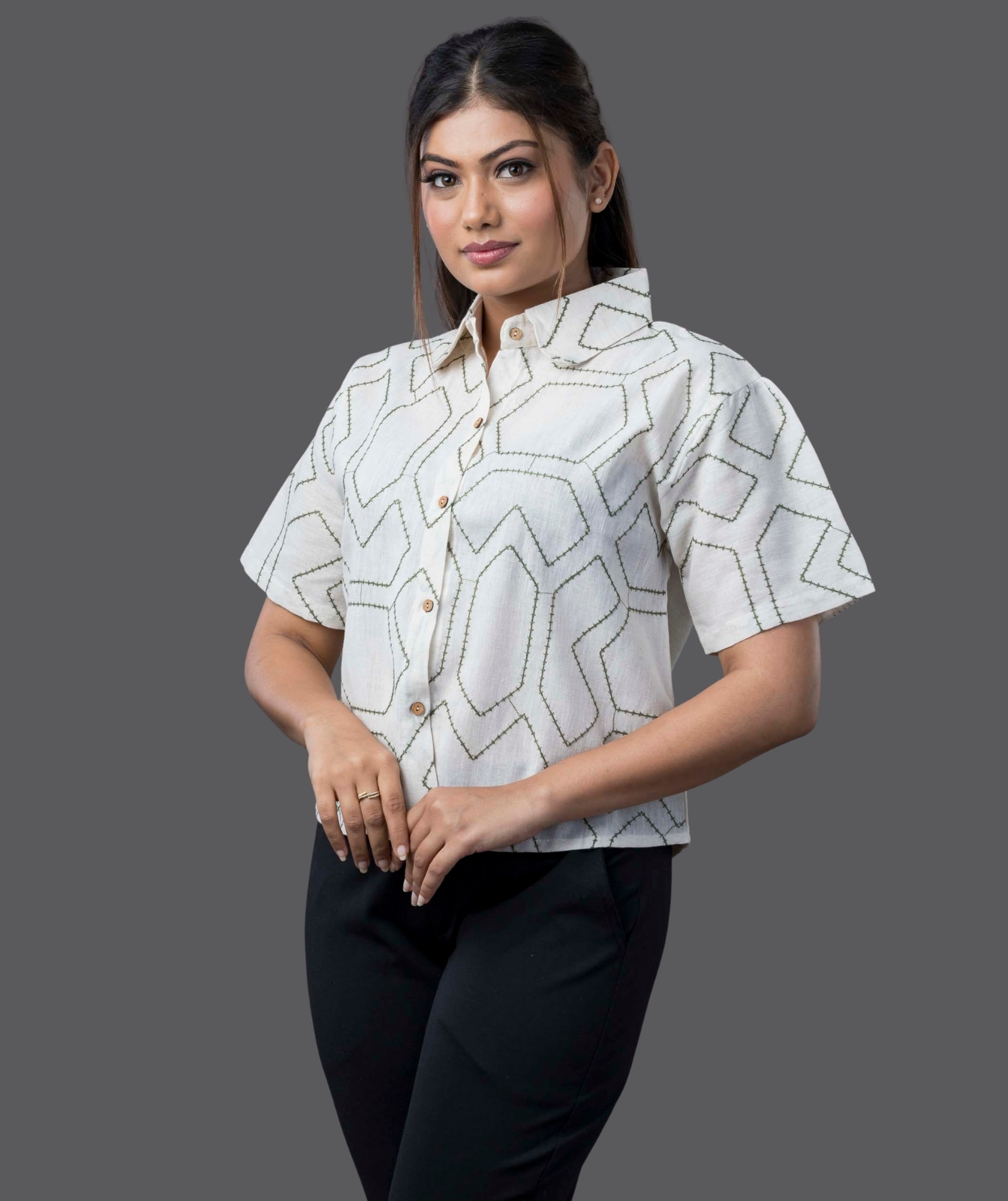 Redefine sustainable fashion with this stylish Hexa Design Khadi Short Shirt. Crafted from premium handwoven khadi, this shirt combines comfort, breathability, and timeless craftsmanship. The unique hexagonal design adds a contemporary touch, making it a standout piece in any wardrobe. Featuring a classic collar, button-down front, and a relaxed short-length fit, this shirt is perfect for effortless styling. Pair it with high-waisted pants, denim, or skirts for a chic yet comfortable look.