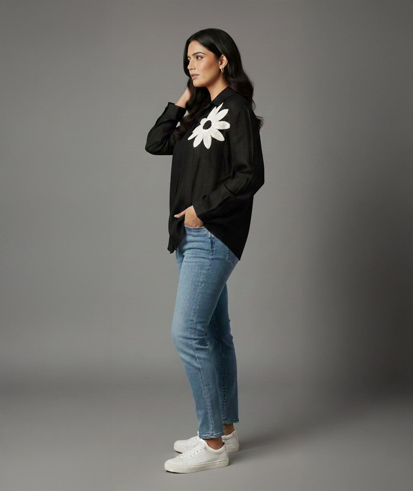 stylish black button-down shirt crafted from a lightweight textured fabric. Adorned with bold handcrafted crochet flower appliqués on the chest and hem, it adds a fun, artistic charm to a relaxed silhouette.