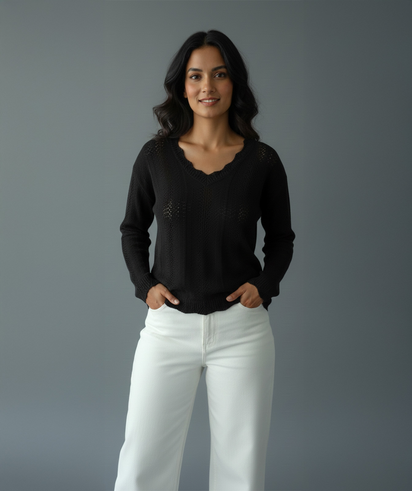 This chic black textured top features an intricate open-knit pattern that adds depth and sophistication to a classic silhouette. Designed with a soft V-neckline, full sleeves, and a relaxed fit, it offers both comfort and effortless style. The delicate knitted detailing along the neckline, sleeves, and hem gives the top a refined handcrafted look. Lightweight and breathable, this piece is perfect for layering or wearing on its own — ideal for casual outings, evening wear, or elevating everyday basics with a touch of elegance.