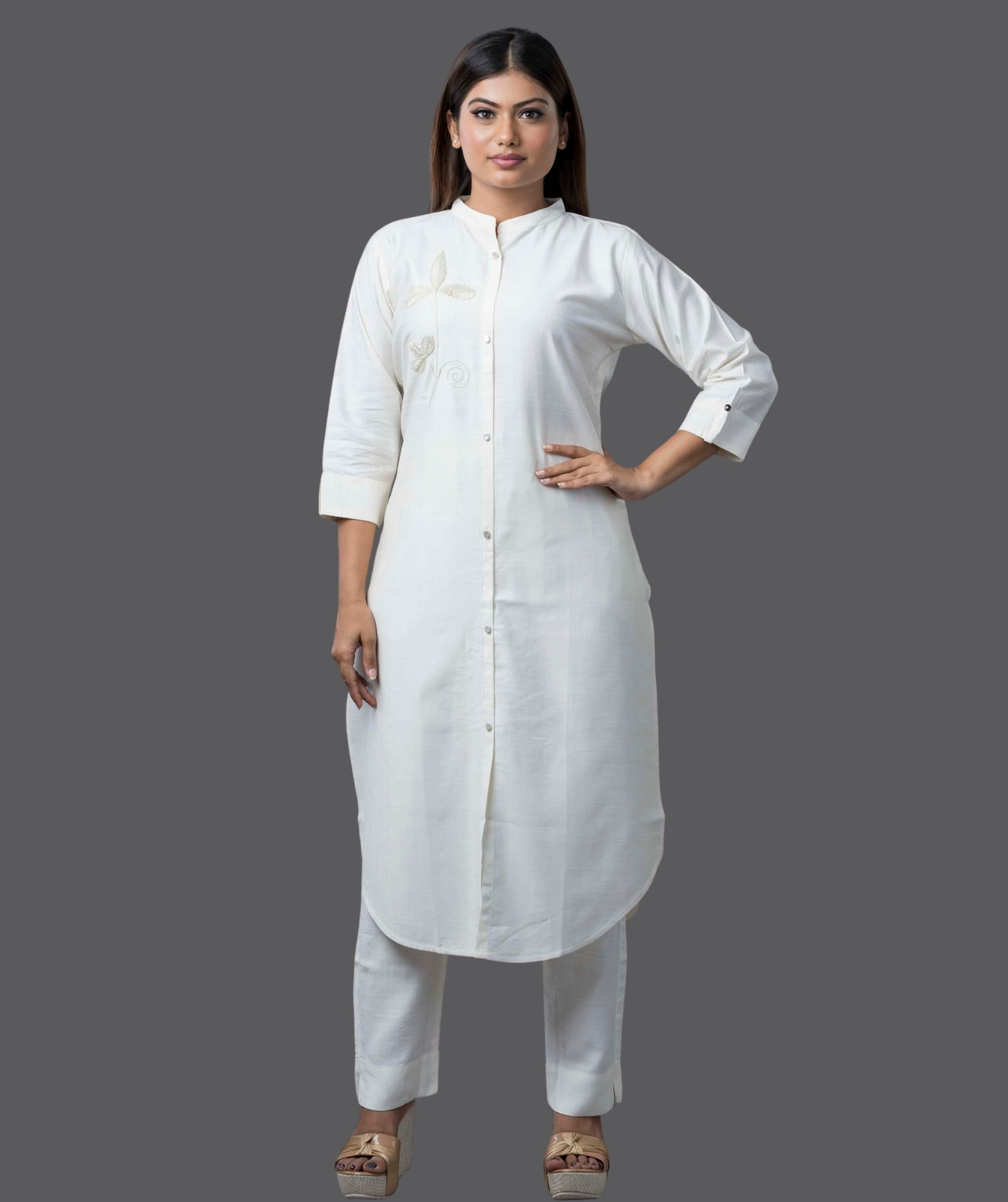 Embrace timeless elegance with this Off-White Silk Long Co-ord Set, beautifully adorned with intricate embroidery. Crafted from premium silk, this ensemble features a long, flowy silhouette that exudes sophistication and grace. The delicate embroidery adds a touch of artisanal charm, making it perfect for festive occasions, formal gatherings, or elegant everyday wear. Designed for comfort and style, this co-ord set includes a tailored top and matching bottoms, offering effortless luxury with a contemporary appeal.