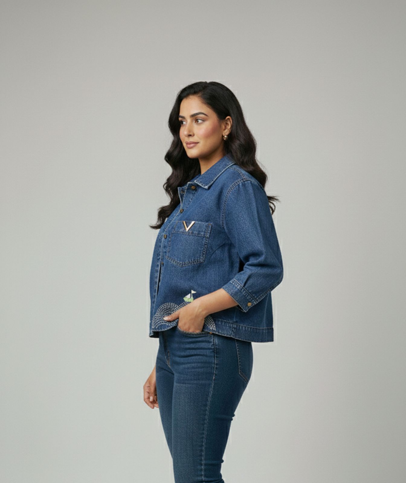 This stylish dark-wash denim shirt features a relaxed, boxy silhouette with a soft, comfortable feel. Designed with a button-down front and a classic collar, it combines everyday ease with artistic detailing. The chest pocket is highlighted with a unique V-shaped embroidered patch, adding a modern, edgy touch. At the bottom hem, the shirt showcases delicate hand-embroidered waves in white thread paired with a charming green sailboat motif, giving it a playful, handcrafted look. The raw-edge curved hem enhances the casual vibe, making this denim piece perfect for layering or wearing on its own.