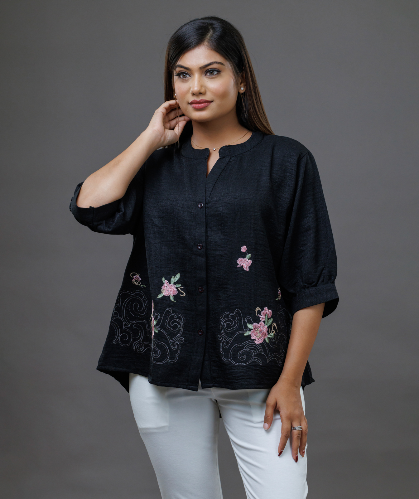 Add a touch of nature’s beauty to your wardrobe with this Floral Embroidery Shirt. Crafted from soft, breathable crushed textured fabric, it features exquisite floral embroidery that delicately winds across the fabric, creating a stunning contrast against the shirt’s base. With its relaxed fit, button-down design, this shirt is both versatile and effortlessly stylish. Whether tucked into trousers, layered over a skirt, or worn casually with denim, the floral details bring a refreshing, feminine vibe to any outfit. Perfect for day-to-night wear, this shirt brings the beauty of blossoms to your everyday style.