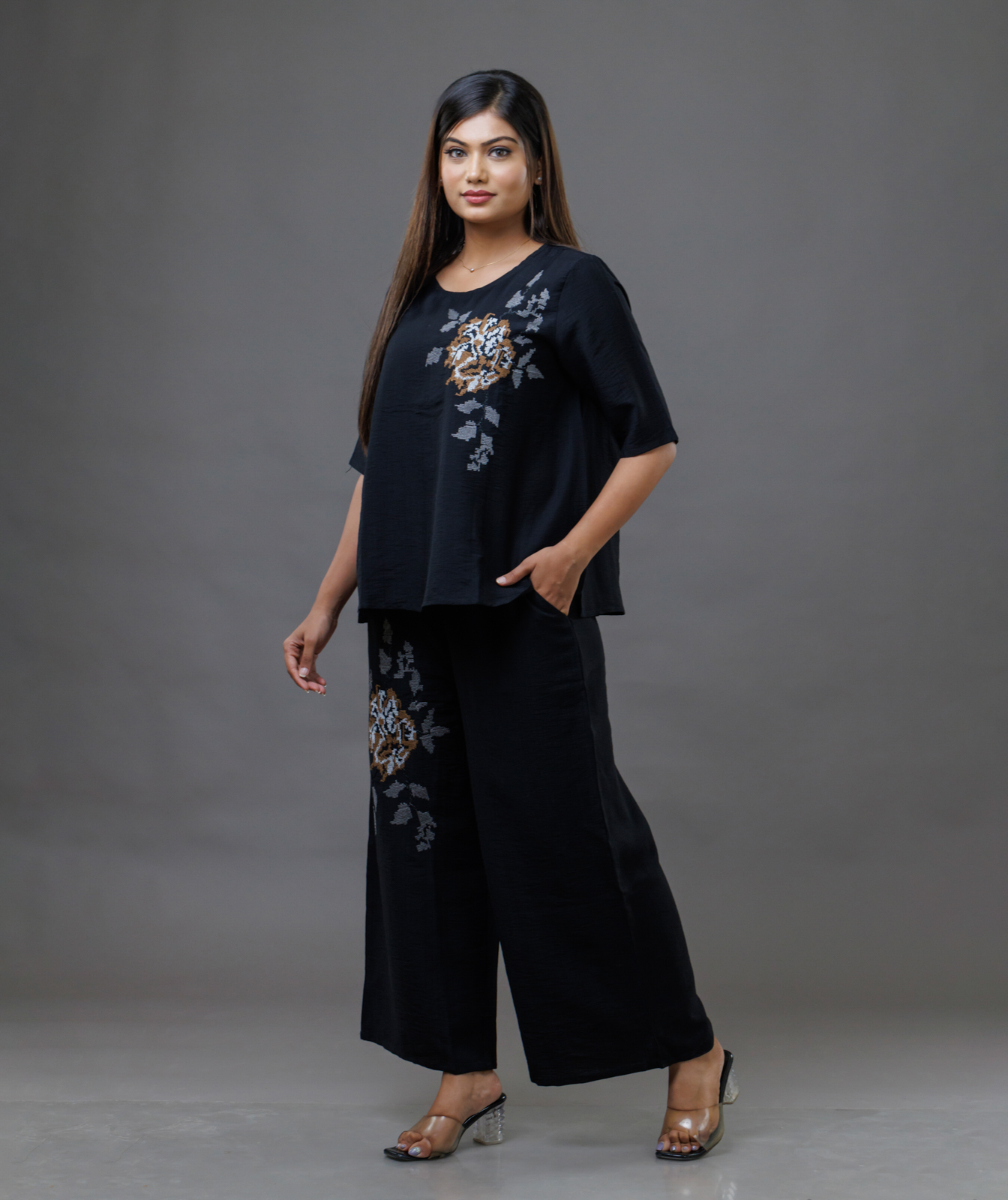 Step into the season in style with this Floral Motif Co-Ord Set, a perfect blend of comfort and elegance. Featuring a beautiful floral motif, this matching set radiates a fresh, vibrant energy that’s ideal for sunny days or relaxed evenings. The top and pant is designed with intricate floral detailing, made from breathable fabric, creating a stylised look. Whether you're heading to a brunch date, weekend getaway, or casual outing, this co-ord set offers versatility, allowing you to mix and match with ease.