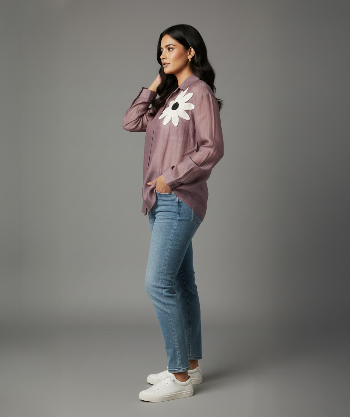 stylish mauve button-down shirt crafted from a lightweight textured fabric. Adorned with bold handcrafted crochet flower appliqués on the chest and hem, it adds a fun, artistic charm to a relaxed silhouette.