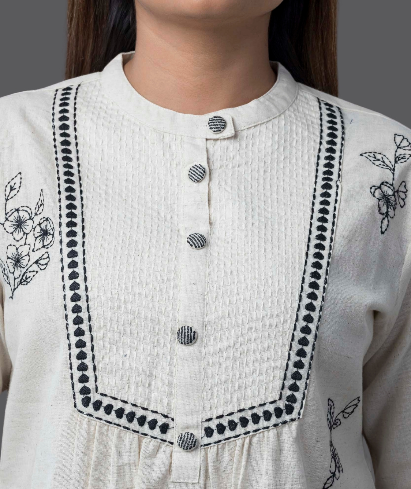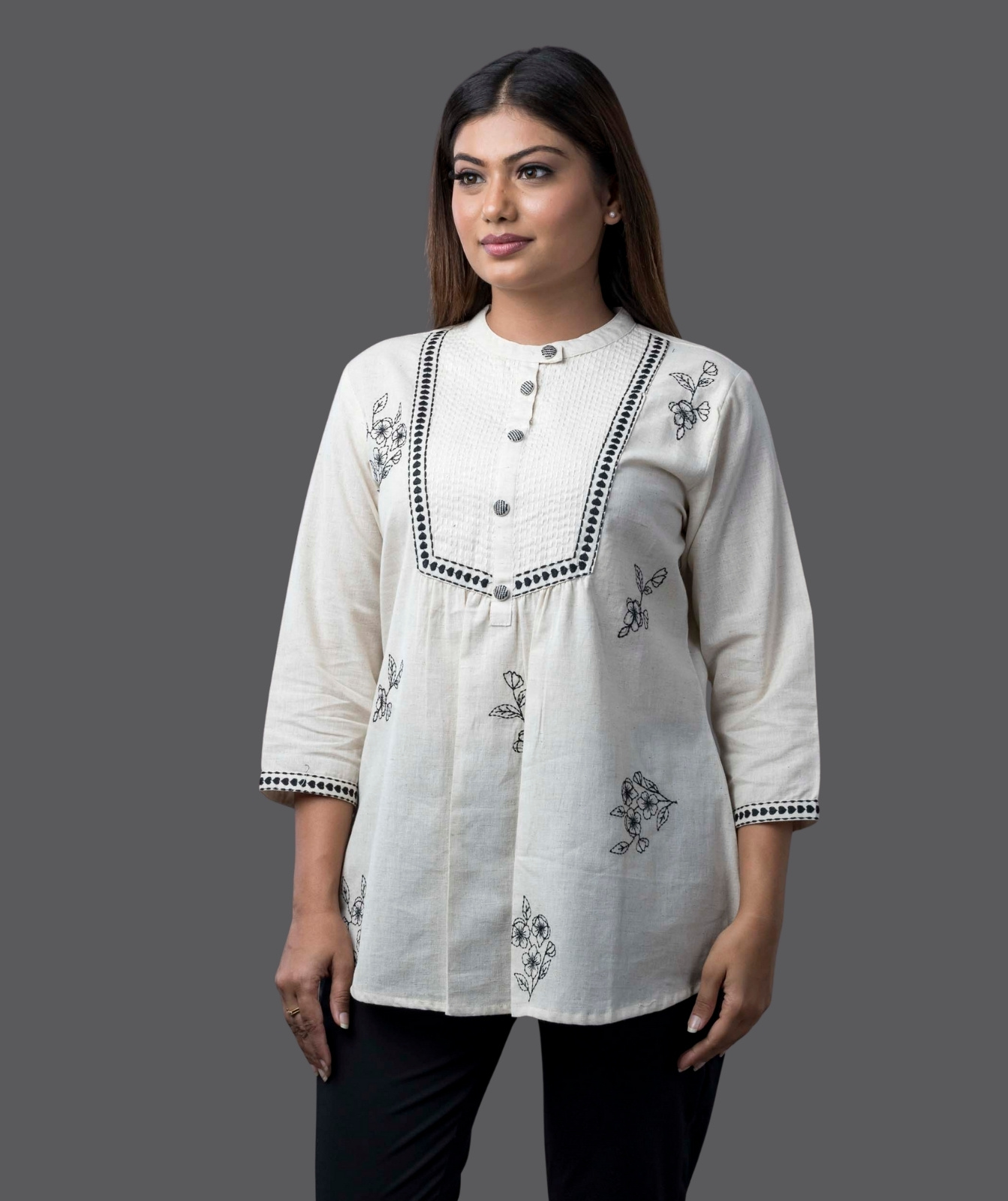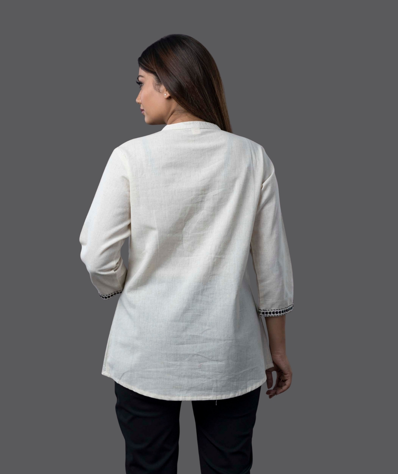 Embrace effortless elegance with this beautifully crafted Khadi Short Kurti. Made from premium handwoven khadi, this kurti offers a perfect blend of comfort, breathability, and style. The minimal yet sophisticated design makes it a versatile addition to your wardrobe, ideal for both casual and semi-formal occasions. Featuring a flattering silhouette, delicate detailing, and a soft texture, this kurti pairs effortlessly with jeans, palazzos, or skirts for a chic, timeless look.