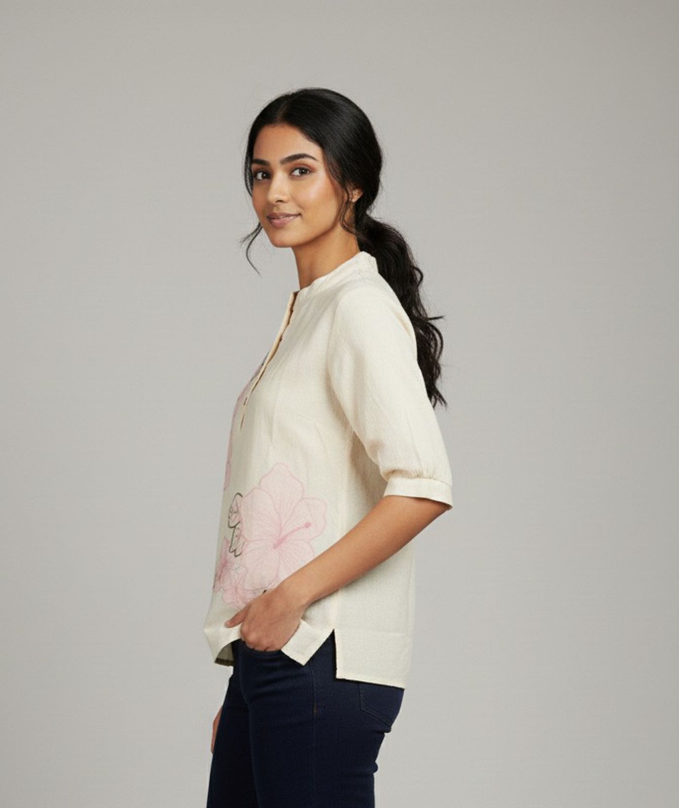A lightweight cream top featuring soft blush floral prints and a modern mandarin collar. The pastel pink buttons and flowy silhouette make it perfect for warm-weather comfort and stylish daily wear.