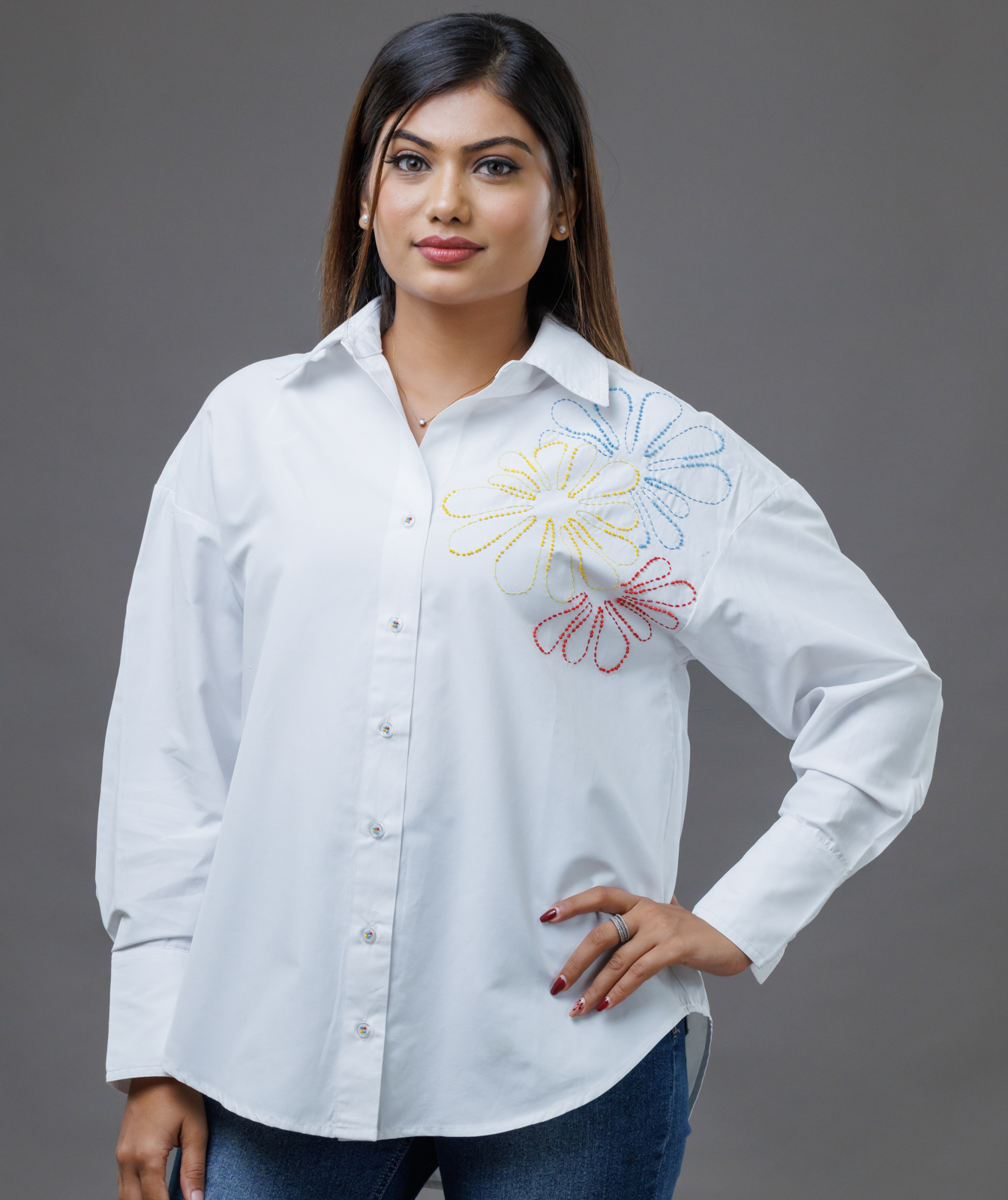 Feminine and effortlessly stylish, the Flower Beaded Off-Shoulder White Shirt brings a touch of elegance to modern styling. Featuring delicately hand-beaded floral motifs, the crisp white fabric offers a clean, airy feel — perfect for daytime glamour or evening sophistication.