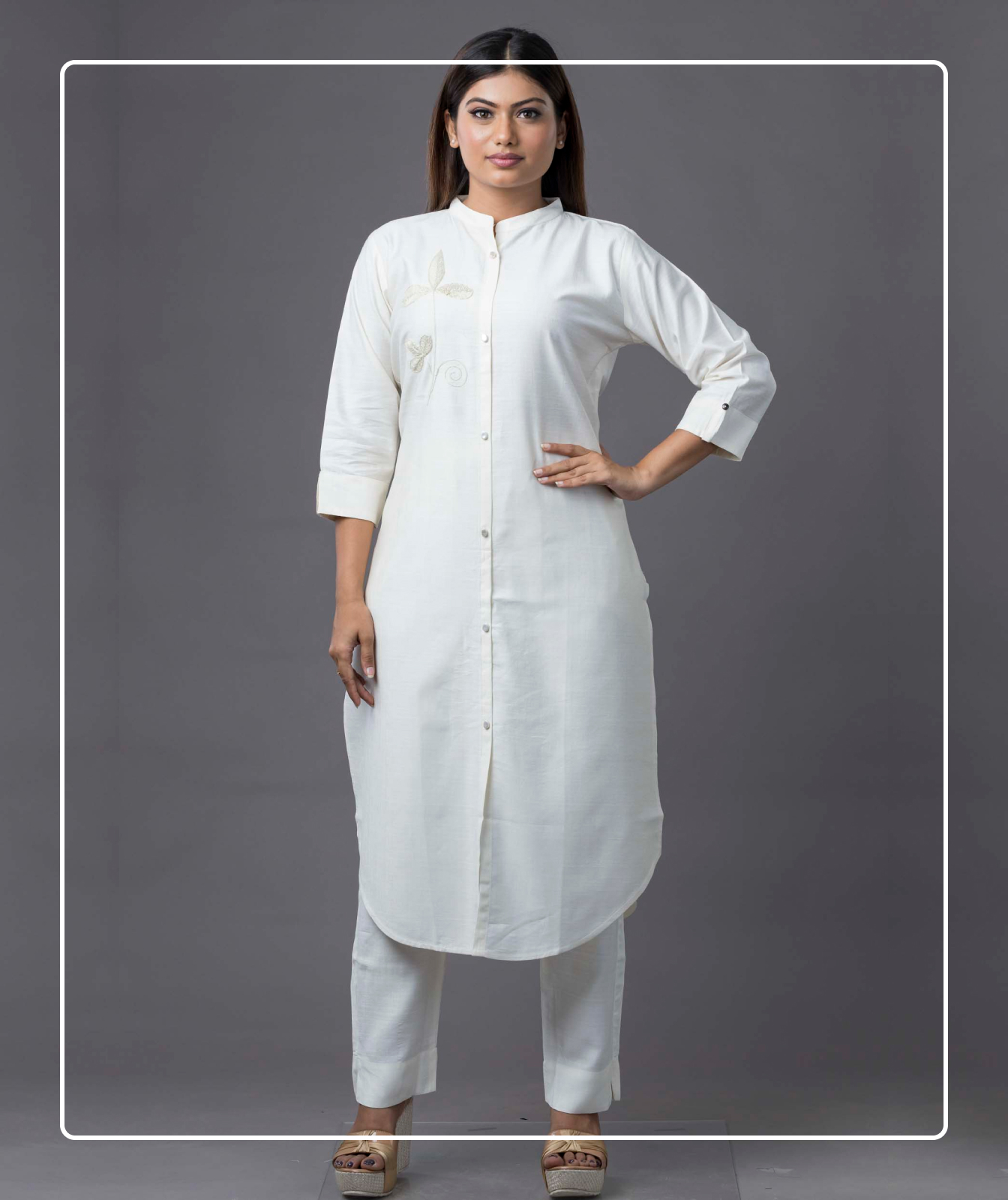 Embrace timeless elegance with this Off-White Silk Long Co-ord Set, beautifully adorned with intricate embroidery. Crafted from premium silk, this ensemble features a long, flowy silhouette that exudes sophistication and grace. The delicate embroidery adds a touch of artisanal charm, making it perfect for festive occasions, formal gatherings, or elegant everyday wear. Designed for comfort and style, this co-ord set includes a tailored top and matching bottoms, offering effortless luxury with a contemporary appeal.