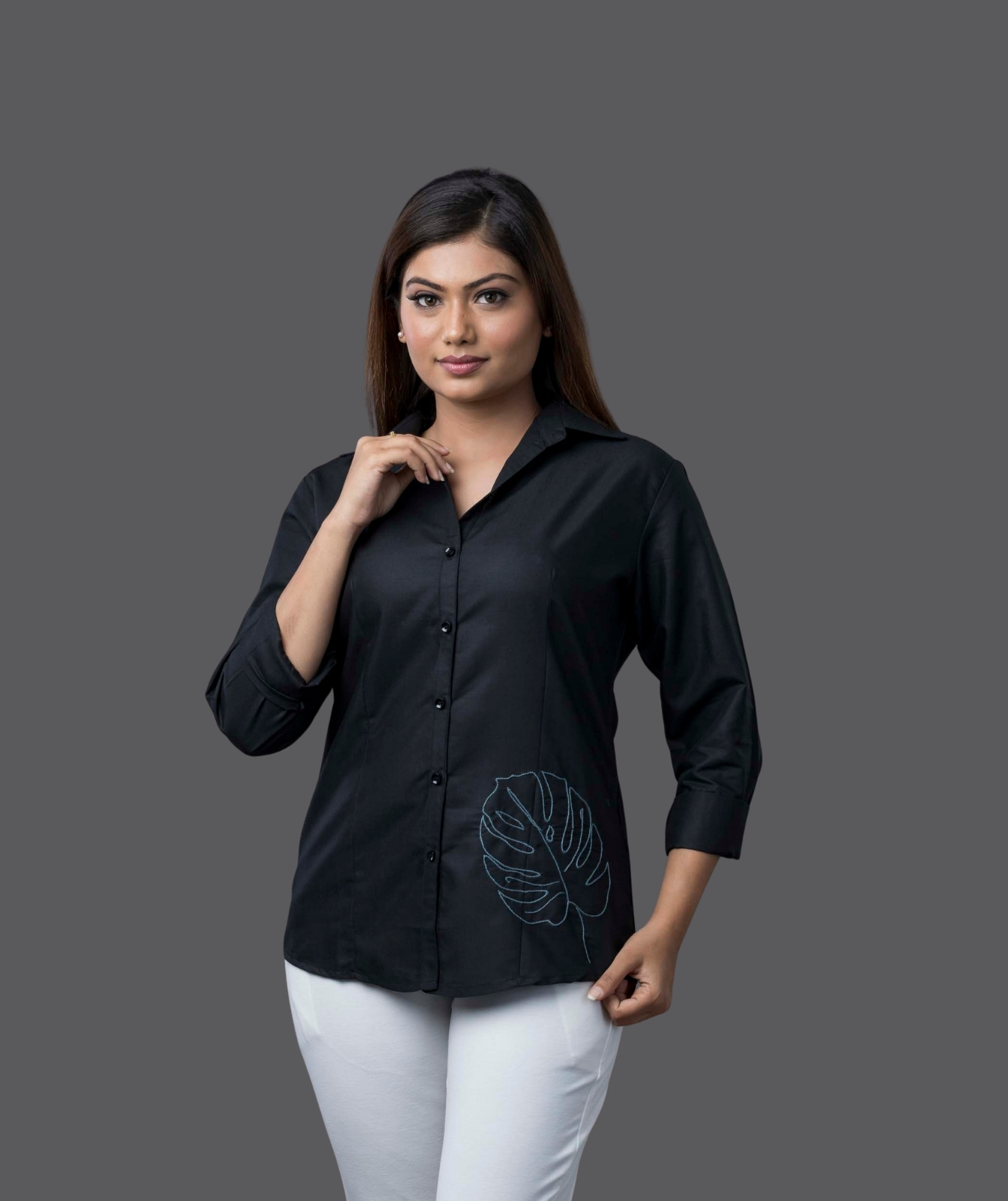Experience the perfect blend of elegance and craftsmanship with this Tux Cotton Shirt, featuring exquisite hand-embroidered leaf motifs. Crafted from premium cotton, this shirt offers a breathable, soft texture for all-day comfort. The delicate embroidery adds an artisanal touch, making it a timeless wardrobe essential. Designed with a classic collar and a relaxed fit, this piece effortlessly