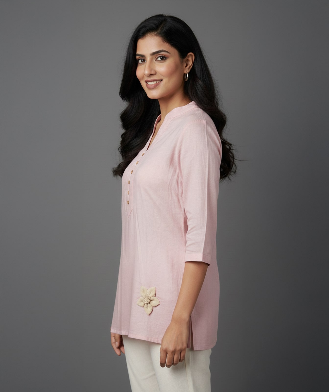 This elegant pastel dusty pink kurti top features a soft, breathable texture perfect for everyday comfort. The design includes a V-slit neckline with a mandarin collar, enhanced by a row of wooden buttons that add a natural, handcrafted charm. The 3/4th sleeves keep the look airy and versatile.A highlight of the piece is the handcrafted jute floral applique near the hem, bringing a unique artisanal touch that reflects DnA’s signature detailing. The silhouette is relaxed and easy to wear, making it ideal for casual outings, workwear, or minimal festive styling.